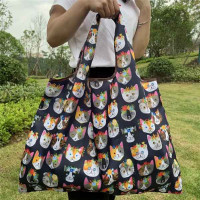 Large Capacity Foldable Tote Bag With Cute Cat Print, Nylon Material Lightweight & Portable Shopping Handbag