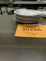 Set of 7 small plates, white colored with green flower design, good condition.