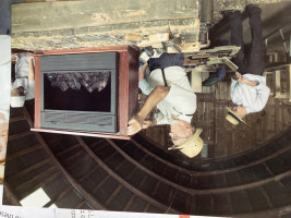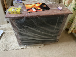 Brand new and never used Amish built flameless electrical fireplace. On wheels and has beautiful wood cabinet