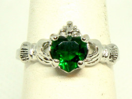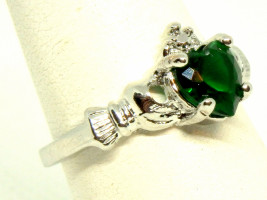 For Your Consideration: ~ A Beautiful Ring ~ Perfect Gift ~ Metal: Silver Filled.- Main Stone: Emerald Green Crystal Heart Cut- Additional Stone: Diamond White Crystal Round Cut.~ Size: 8 ~ Design: Heart With Crown.~ May Birthstone ~ *The Claddagh's distinctive design features two hands clasping a heart, and surmounted by a crown. The elements of this symbol correspond to the qualities of love (The Heart), Friendship (The Hands), and Loyalty (The Crown). The expression which was associated with these symbols in the giving of the ring was: ~~ "With My Two Hands I Give You My Heart, And Crown It With My Love.*~~ The Stones are 30X Loupe Clean.~ The Ring is New, Never Worn. Comes With Ring Box.