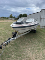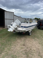 And trailer. Clean boat, no leaks, two gas tanks, new battery, bilge pump, motor needs work, I’m no mechanic, runs rough. Selling as is, no warranty. Clear tiles & registration.