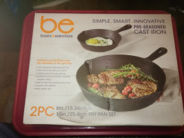 This is a new in box never used Basic Essential Brand 2 piece Pre seasoned Cast Iron Skillet set. One is 6", the other is 10". Box is not perfect, as has been stored in closet so may have some dings in the box. Does not AFFECT the skillets.