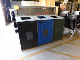 A large triple commercial trash can with three individual bins for landfill, recycle, and compost. Show signs of wear and tear.