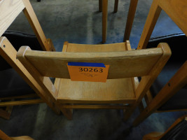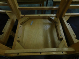 Pair of wooden chairs with no padding, both show signs of wear and tear