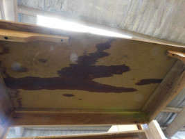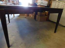 large dining table with mahogany like finish, built in middle leaf, 54” long 54” wide 30” tall, shows signs of wear and tear