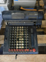 2 vintage calculating machines. Operating condition of each machine is unknown. Both show normal signs of wear and tear. Wooden pallet pictured is not included.