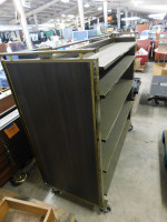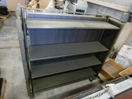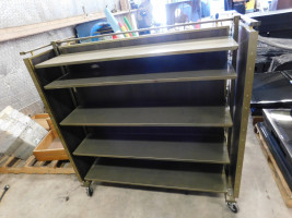 A large rolling cart manufactured by OPTO. Dimensions of the cart are 55” wide 24” deep and 56” tall. Shows normal signs of wear and tear.