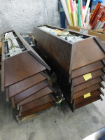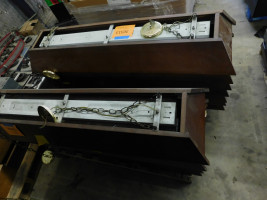 Lot of 13 pool table ceiling light fixtures. Dimensions of each fixture are roughly 60” wide 15” deep and 8” tall. Operating condition of each fixture is unknown. All show signs of normal wear and tear. Wooden pallet pictured is not included.