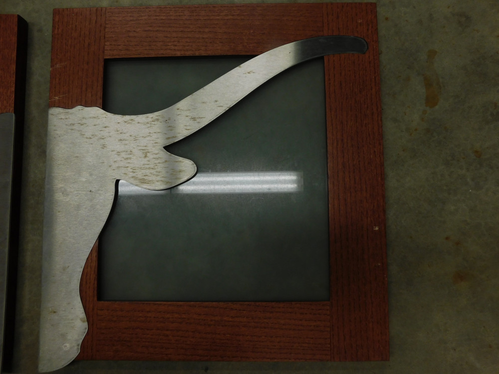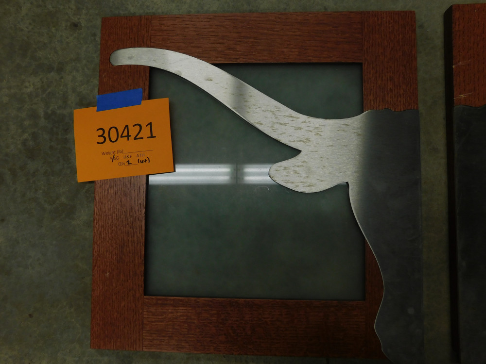A pair of deconstructed cabinet doors composed of a cherry-like wood, opaque glass, and a chrome UT Longhorn symbol obtained from the Frank Erwin Center. Dimensions of each door are 17.5” wide by 18.75” tall. Both doors show normal signs of wear and tear and are missing both hinges.