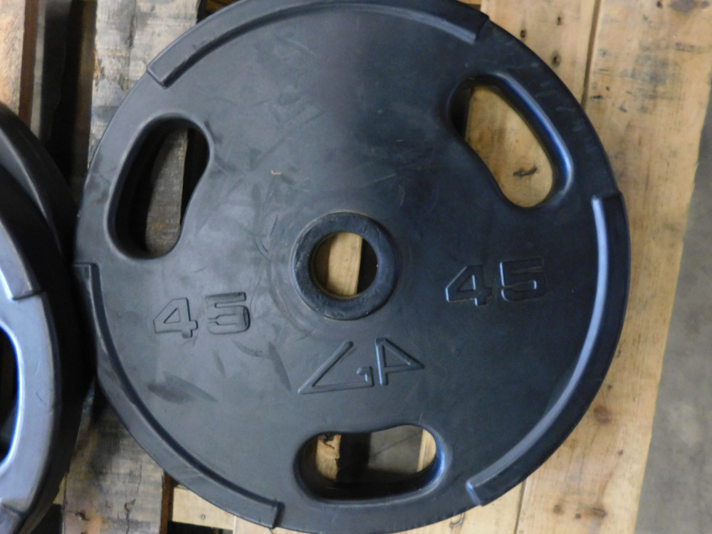 A pair of 45lb weight plates manufactured by GP. The diameter of each plate is 17”. Both plates show normal signs of wear and tear.