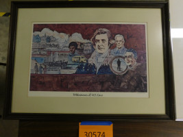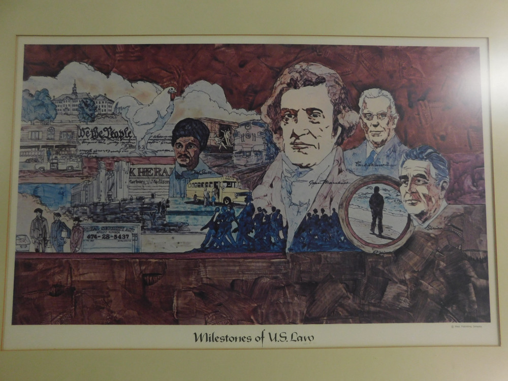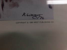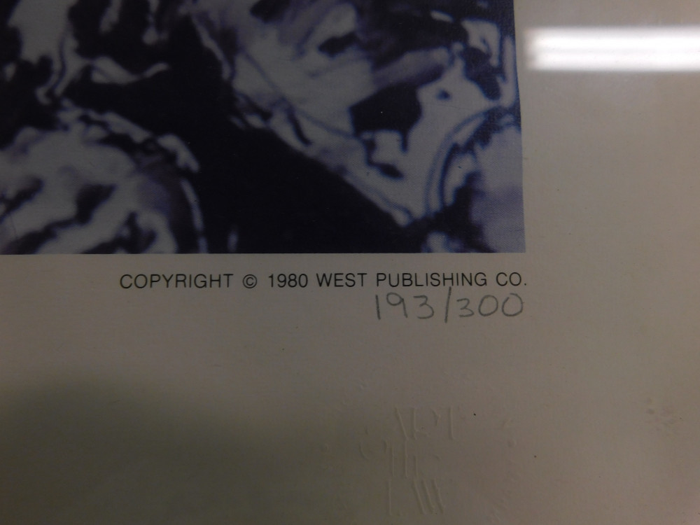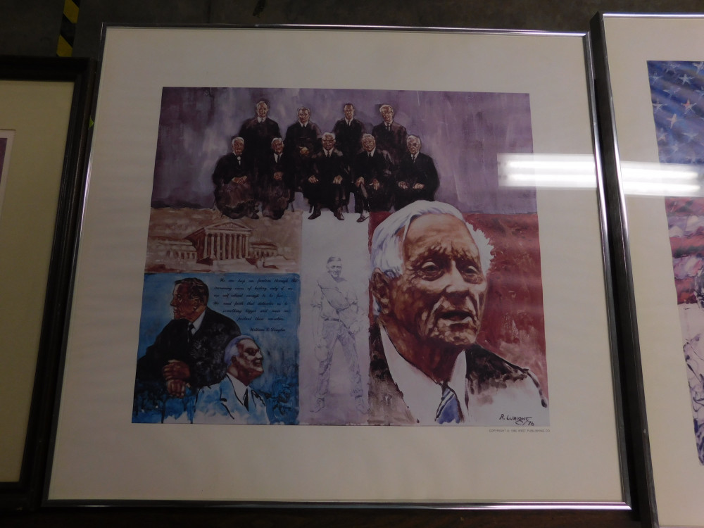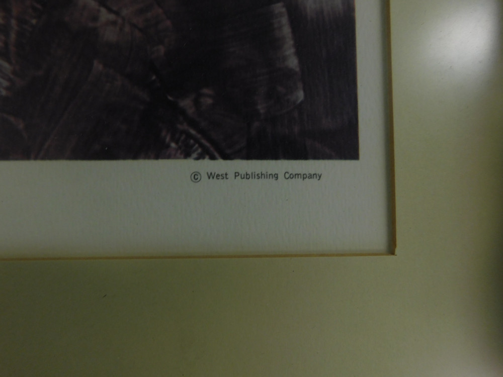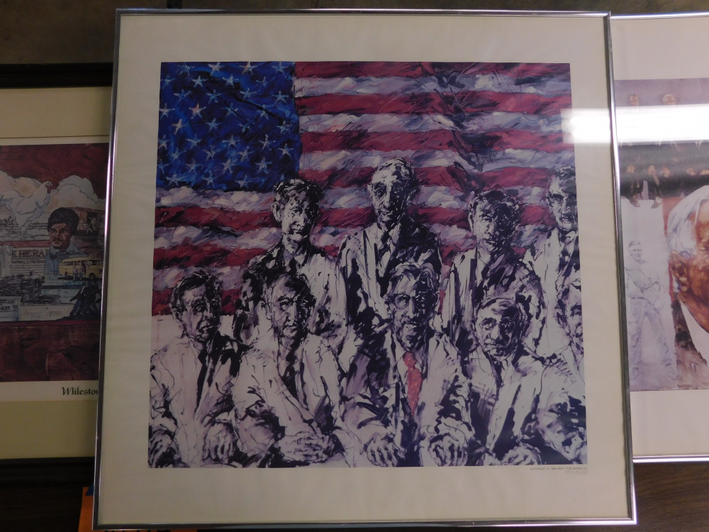 Lot of 3 patriotic prints by West Publishing. Dimensions of the two in silver frames are 2’ x 2’. The dimensions of the one in the brown frame is 27.5” x 20”. All show normal signs of wear and tear.