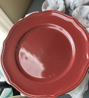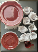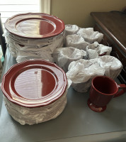 Set of dishes. Includes 8 bowls, 8 coffee cups, 12 dinner plates, 8 salad plates. Some chips on edges but still a good set.