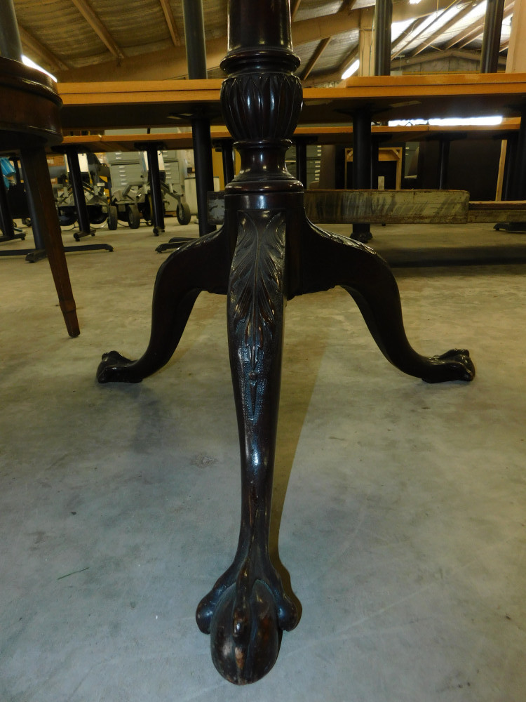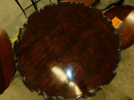 Chippendale style mahogany. Table surface is 33.5” in diameter and stands 29” tall. Shows normal signs of wear and tear.