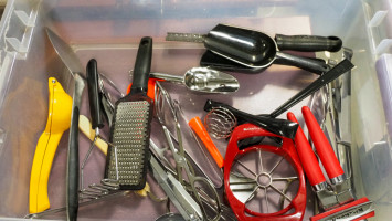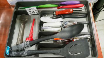Serving utensils, spatulas, apple cutter, can openers, pizza cutter, knives, and more