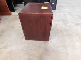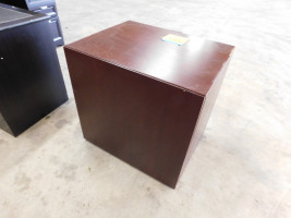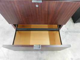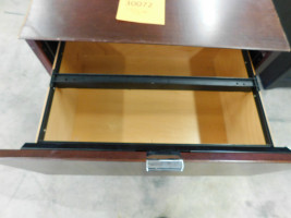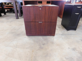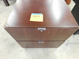A single two drawer file cabinet, cherry wood in color, with rails inside drawers for double width, shows signs of normal wear and tear, dimensions, are 30” wide x 24” deep x 30” tall.