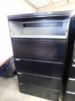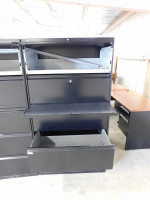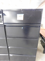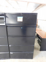 Two black lateral file cabinets, five drawers with a middle pull out shelve, NO KEYS AVAILABLE, both show signs of heavy wear and tear, made by HON, dimensions are 36” wide x 19” deep x 67” tall.