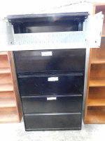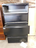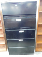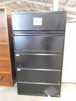 Two black lateral file cabinets, five drawers with a middle pull out shelve, NO KEYS AVAILABLE, both shows signs of heavy wear and tear, made by HON, dimensions are 36” wide x 19” deep x 67” tall.