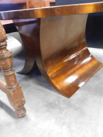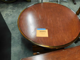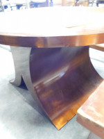One round coffee table, with a orange in color metal base and trim for the cherry in color wooden top. Has scratches and shows signs of wear a and tear, dimensions 36” in diameter x 21” tall.