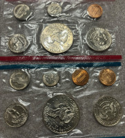 This is a 1974 U.S. Mint Set, issued by the US Mint and consisting of 13 coins, including in this case an Eisenhower $1 coin. The set includes coins from the Denver and Philadelphia mints, and are perfect for any collector of US coins. The coins are uncirculated. This is a must-have item for any serious collector of US coins or as a great memento to commemorate a speacial year (birth or aniversary.) It is sure to be a prized addition to any collection. Don't miss out on this opportunity to own a piece of US history.