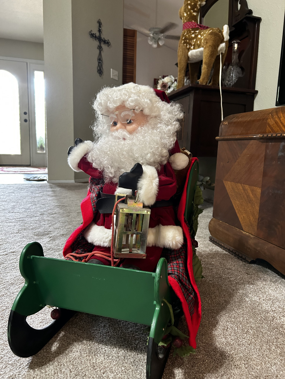 Vintage, large, animated Santa in sleigh. Deer is listed separately. See them move here on video, lower part of screen. https://youtube.com/shorts/DFYGzpY9Z0s?si=e0b5EcniSds4v3BO