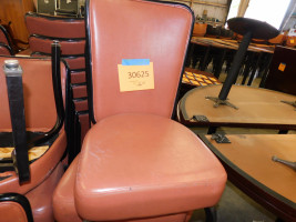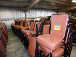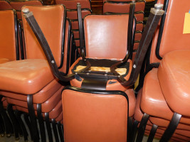140 metal, stackable banquet chairs, black metal base with orange seat cushion and seat back, shows signs of heavy wear and tear