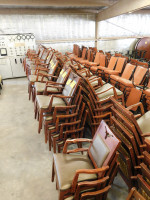 Four wooden, longhorn stackable chairs, amber in color, made by St. Timothy Chair, seat cushion and back, longhorn cut out on seat back, arms show wear and tear FIRST FOUR CHAIRS OFF THE STACK !!!