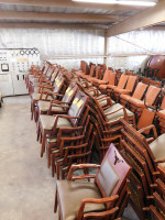 Four wooden, longhorn stackable chairs, amber in color, made by St. Timothy Chair, seat cushion and back, longhorn cut out on seat back, arms show wear and tear FIRST FOUR CHAIRS OFF THE STACK !!!