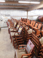 Four wooden, longhorn stackable chairs, amber in color, made by St. Timothy Chair, seat cushion and back, longhorn cut out on seat back, arms show wear and tear FIRST FOUR CHAIRS OFF THE STACK !!!