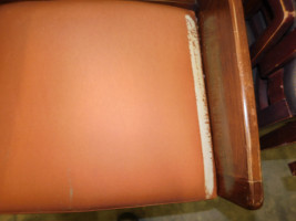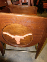 Wooden captain chairs with wooden seat back, longhorn logo marked on sides, soft orange seat cushion with wear and tear