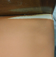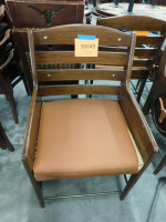 Wooden captain chairs with wooden seat back, longhorn logo marked on sides, soft orange seat cushion with wear and tear