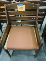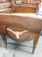 Wooden captain chairs with wooden seat back, longhorn logo marked on sides, soft orange seat cushion with wear and tear