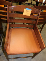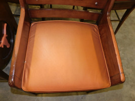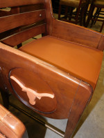Wooden captain chairs with wooden seat back, longhorn logo marked on sides, soft orange seat cushion with wear and tear