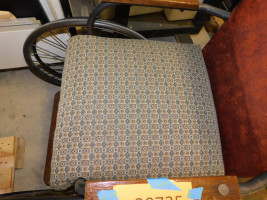Vintage wheelchair with handles, footrest, 2 large front wheels and 2 small back wheels, and patterned seat cushion. Shows signs of wear and tear from previous usage.
