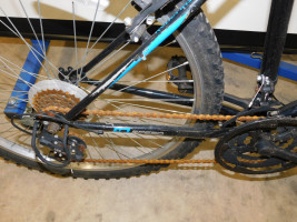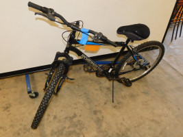 One Roadmaster granite peak mountain bike with 18 speed. Has front shocks with broken front brake and has rust on chain and front wheel. Not working condition, subject to repair.