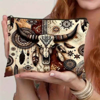 Retro Country Style Cosmetic Pouch - Chic Western Cow Skull Makeup Bag for Women
