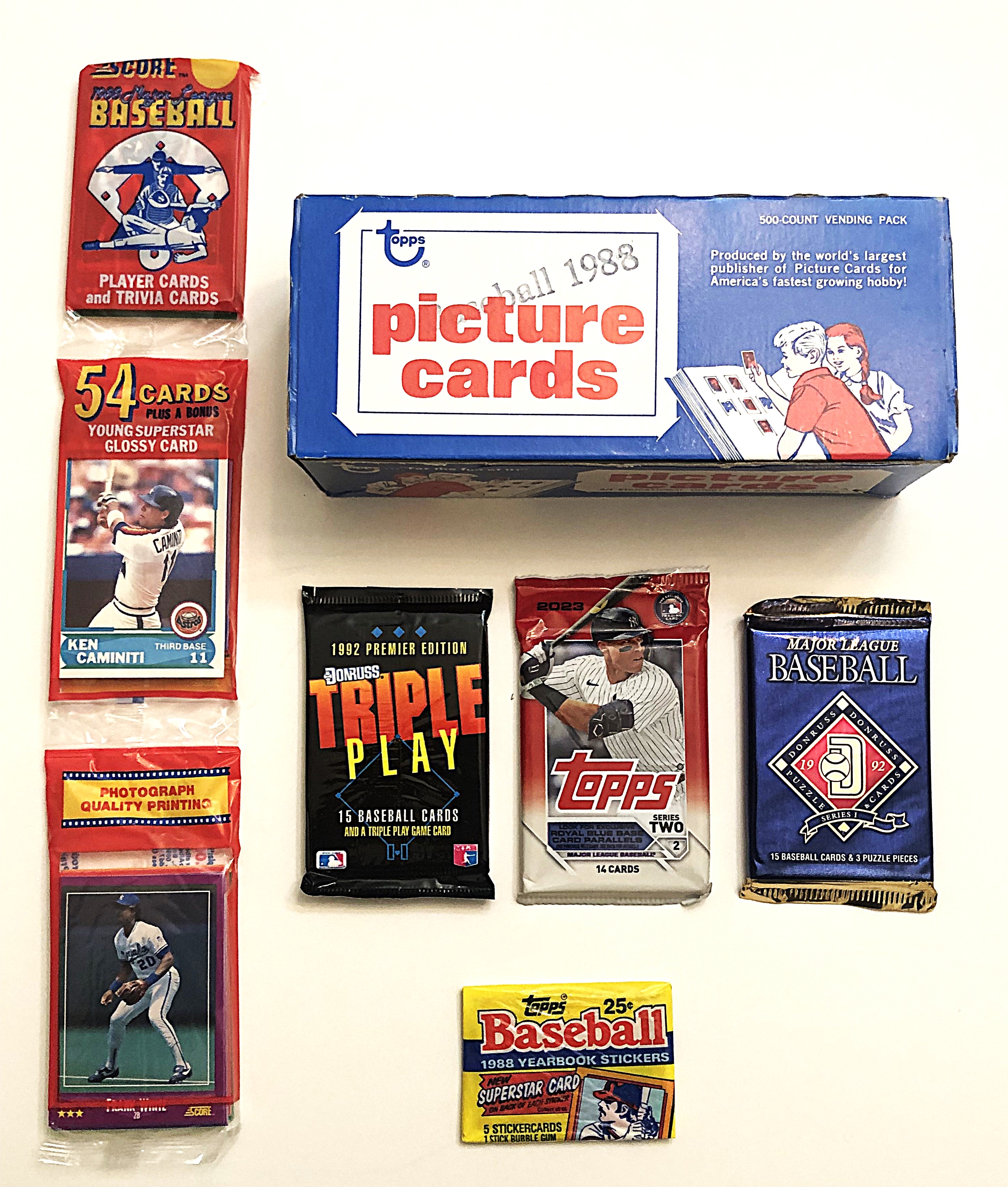 *four baseball card/sticker packs (various brands, years, packaging).