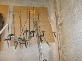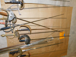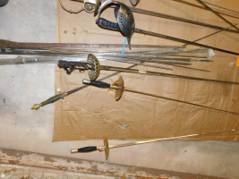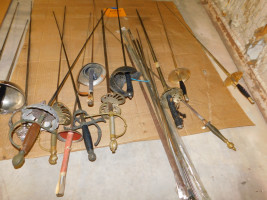 Fourteen fencing swords with extra blade parts. all show signs of heavy wear and tear.