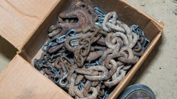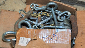 Assorted chain pieces, hooks, links, lifting eyes, tensioners, and more