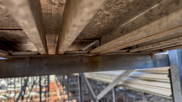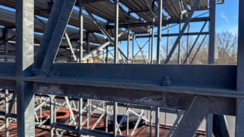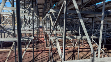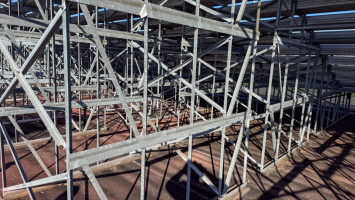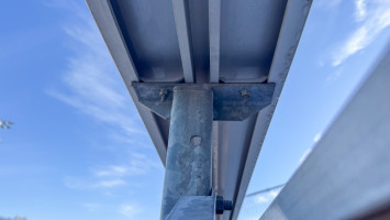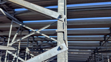 Approximately 86’ x 28’ and 14’ tall to the top seats. Plus a 5’ wide aluminum walkway on the front of the bleachers. 2 aluminum stairs cases. Includes all hand and guard railing. Bench seats are 12’ and 19’ lengths. Galvanized steel framing. Galvanized framing is 98”x40” frames connected together. All bolted construction.