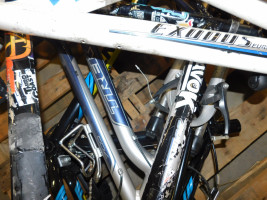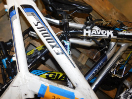 Pallet of bike frames with brands such as Exodus, Havok, Trek, etc. Missing componenets such as wheels, tires, bike seat, etc.