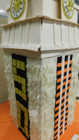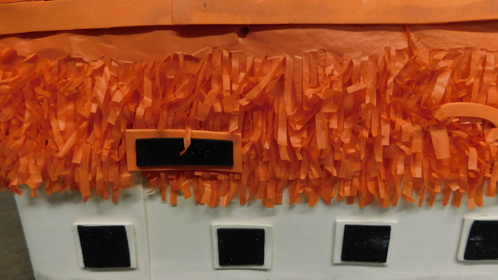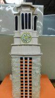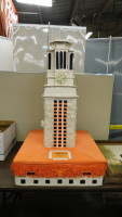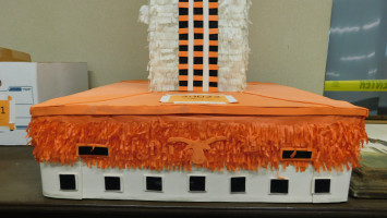 A handscrafted piñata replica of the University of Texas Tower, featuring an orange and white color scheme with black accents. The structure is made of cardboard, tissue paper, and foam felt. Dimensions: 25” x 25” x 43”.