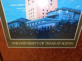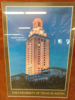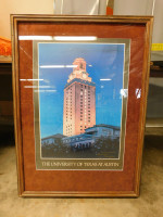 A framed print featuring the University of Texas at Austin’s Main Building, the UT Tower. The frame has a red-brown matte border and the print is behind a protective plastic cover.