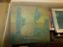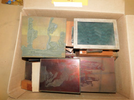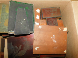Box of vintage printing blocks with engraved/letterpress plates mounted on wood.