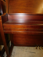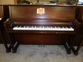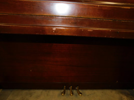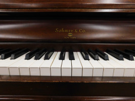 Sohmer & Co. New York 225411 Upright Piano Quarter-Sawn Rock Maple interior with wood finish, three brass pedals, rolling wheels, and sliding fallboard cover. No piano stool. UT staff will not be available for loading. Dimensions: 58” x 12” x 46.”