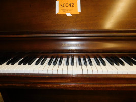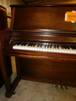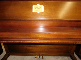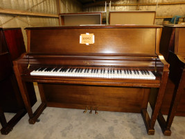 Sohmer & Co. New York 225403 Upright Piano Quarter-Sawn Rock Maple interior with wood finish, three brass pedals, rolling wheels, and sliding fallboard cover.