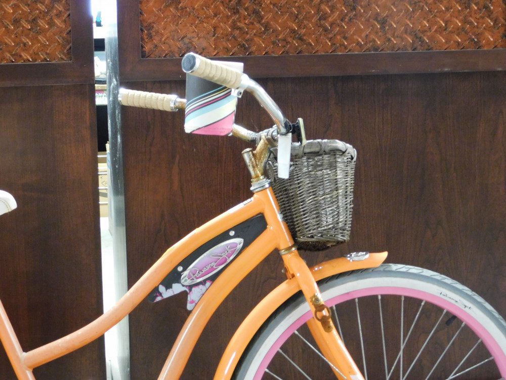 Huffy Panama Jack Orange Cruiser Bike - moderate finish loss. Has front basket and cupholder.