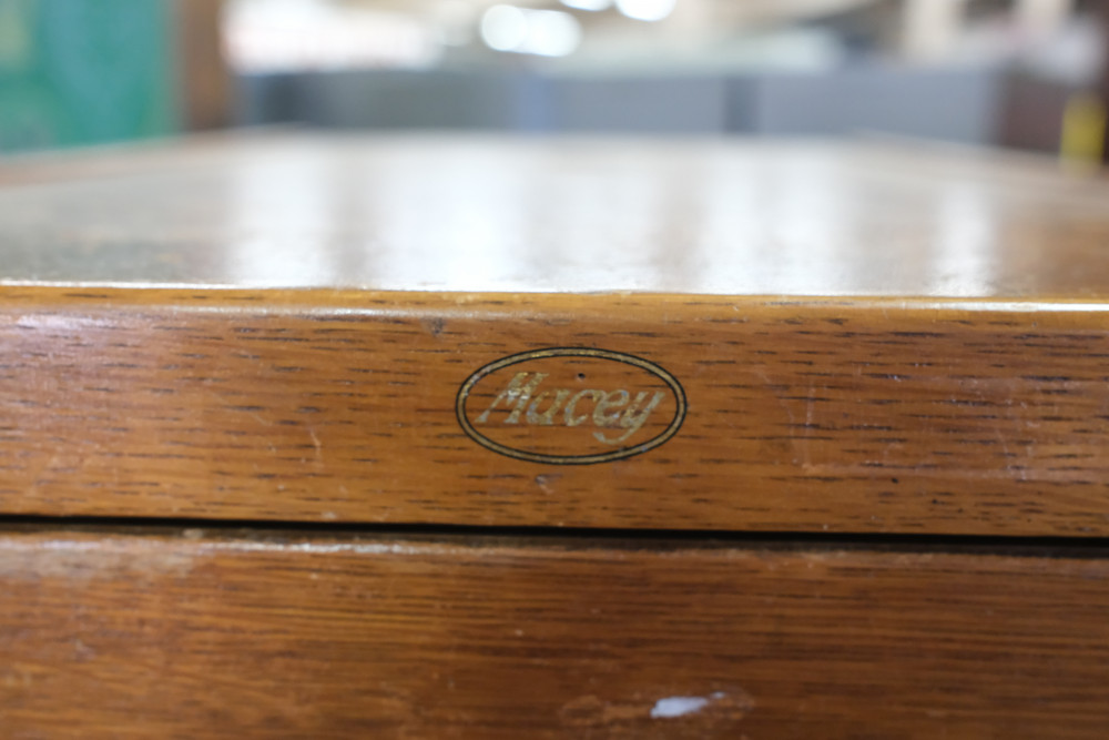 Macey Antique Wood Filing Cabinet - In average condition, all drawers pull out. Is on casters.