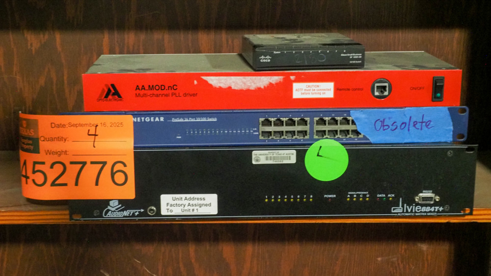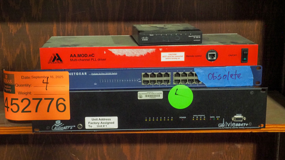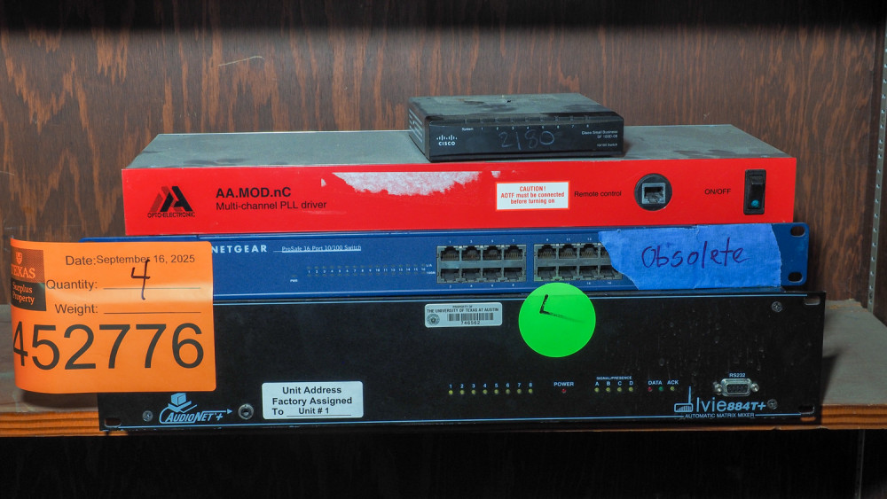 Includes Cisco Small Business SF100D-08 switch, Optoelectronic MOD.NC PLL driver, Netgear ProSafe 16-port 10/100 switch, IVIE 884T+ automatic matrix mixer. Condition:Used, Unknown *The University of Texas at Austin makes no claim of physical or mechanical condition, and functionality of items available through SWICO Auctions. All items are sold “As is, where is”. It is the sole responsibility of the bidder to physically inspect items before bidding and assume all risk. Photos and descriptions are for preview only. All sales are final and no refunds will be issued. Please refer to the SWICO “Terms of Service” in which you have agreed to.