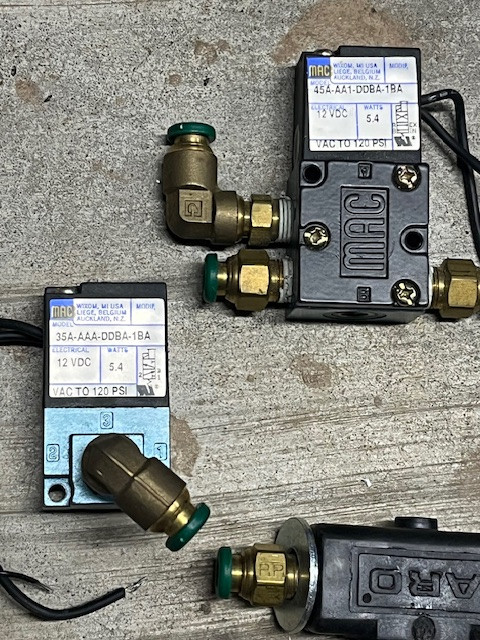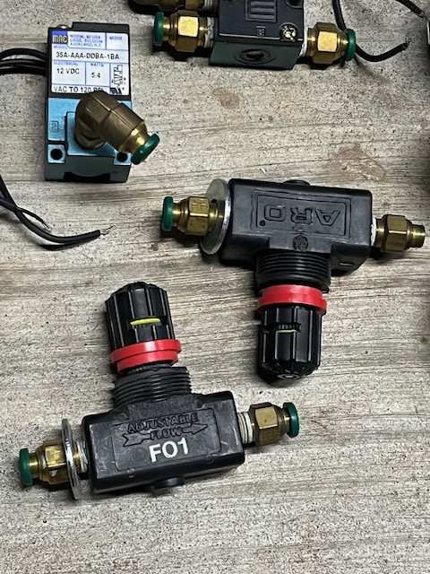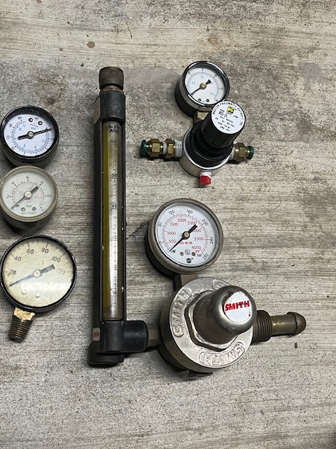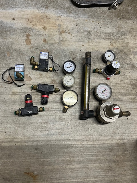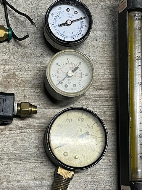 Argon regulator, three small gauges, two manual flow valves, two small 12 volt flow valves and a small regulator.