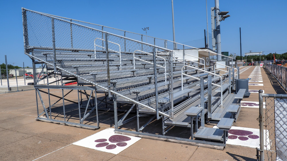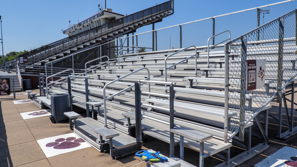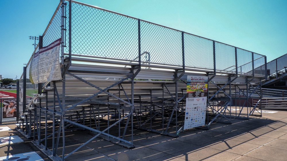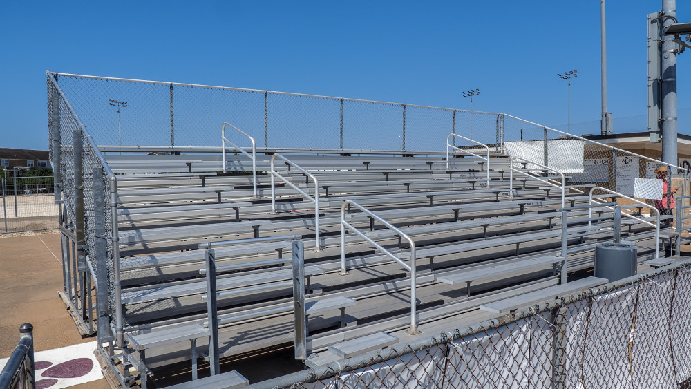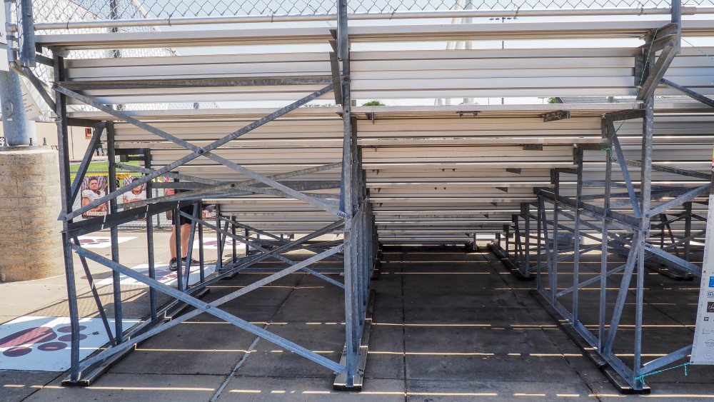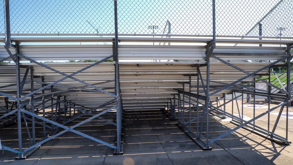 37’6” x 19’6” x 11’6” overall Aluminum seats and foot board. Galvanized framing. Sitting on wood runners. Has hand rails, wheelchair cutout. Forklift assistance is available for loadout, but no help will be provided to dismantle the bleachers. *****Removal for these bleachers must be done between November 10th-14th due to end of football season, and construction starting